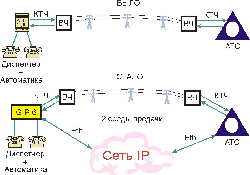 Главное отличие - наличие дополнительного типа соединительной линии - через IP сеть. Какой из двух путей (ВЧ связь или VoIP) будет основным, а какой резервным решается для каждого проекта индивидуально.