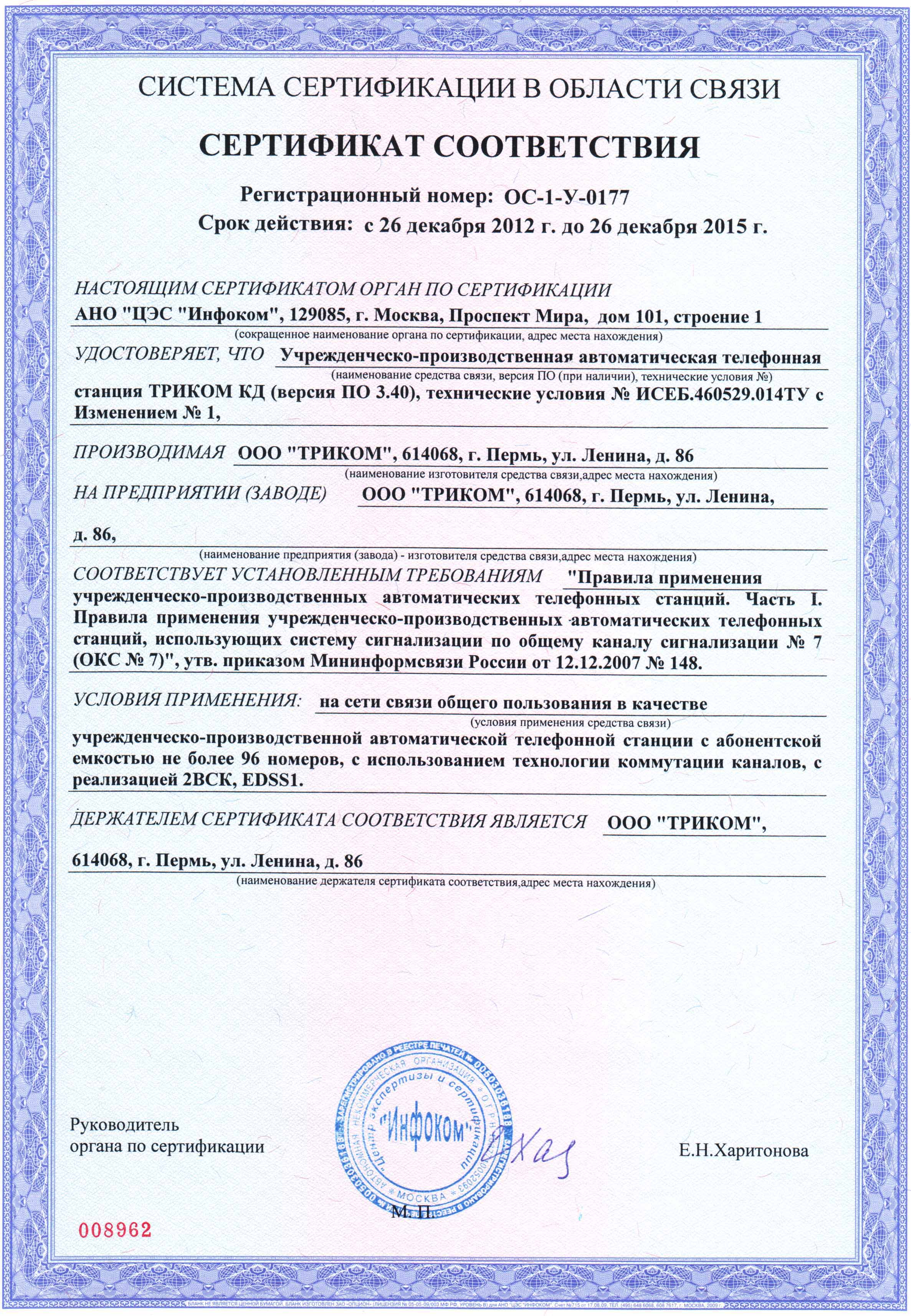 Сертификат соответствия МС №ОС-1-У-0112 от 12.01.2010